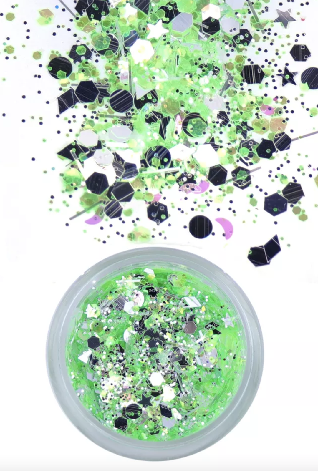 The UV iridescent neon green glitter features various size green and silver glitter. This glitter also glows in the dark under UV light. Great for festivals, parties and more!