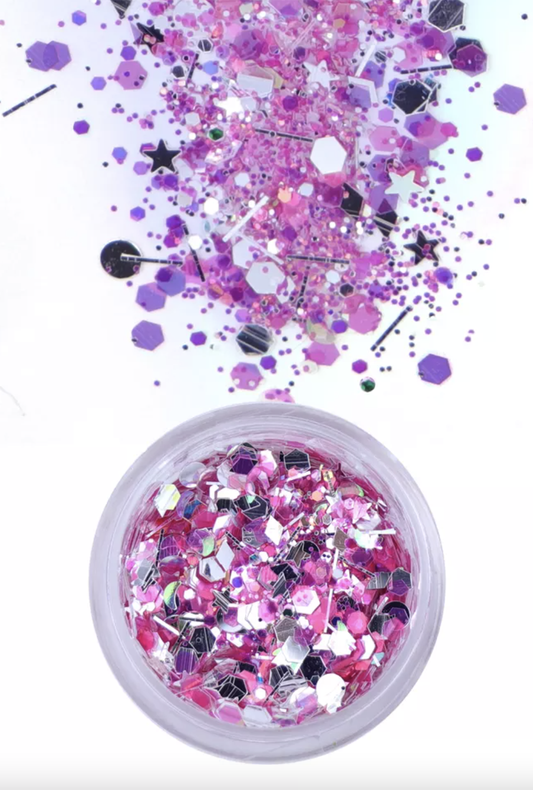 The UV iridescent pink glitter features various size pink and silver glitter. This glitter also glows in the dark under UV light. Great for festivals, parties and more!
